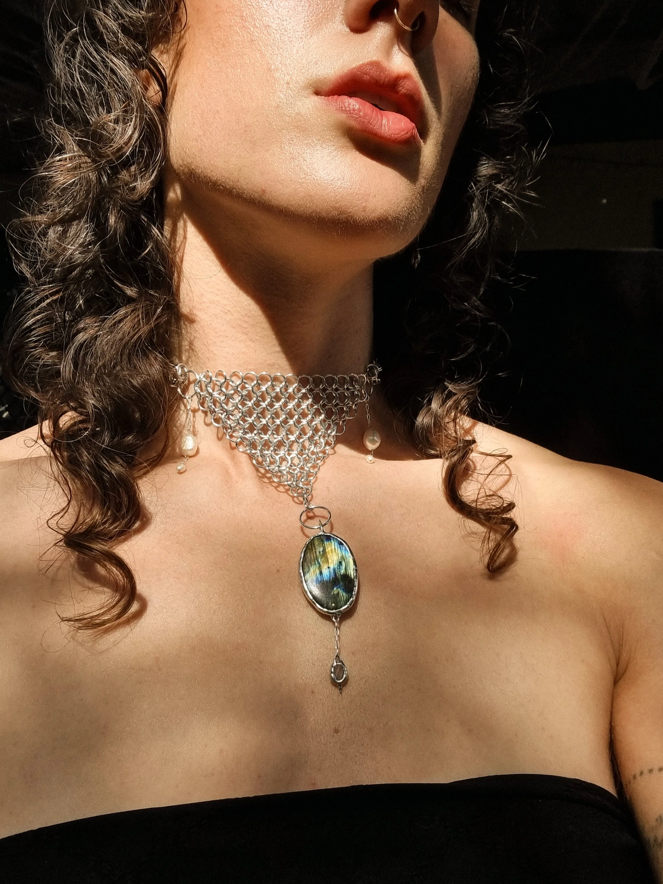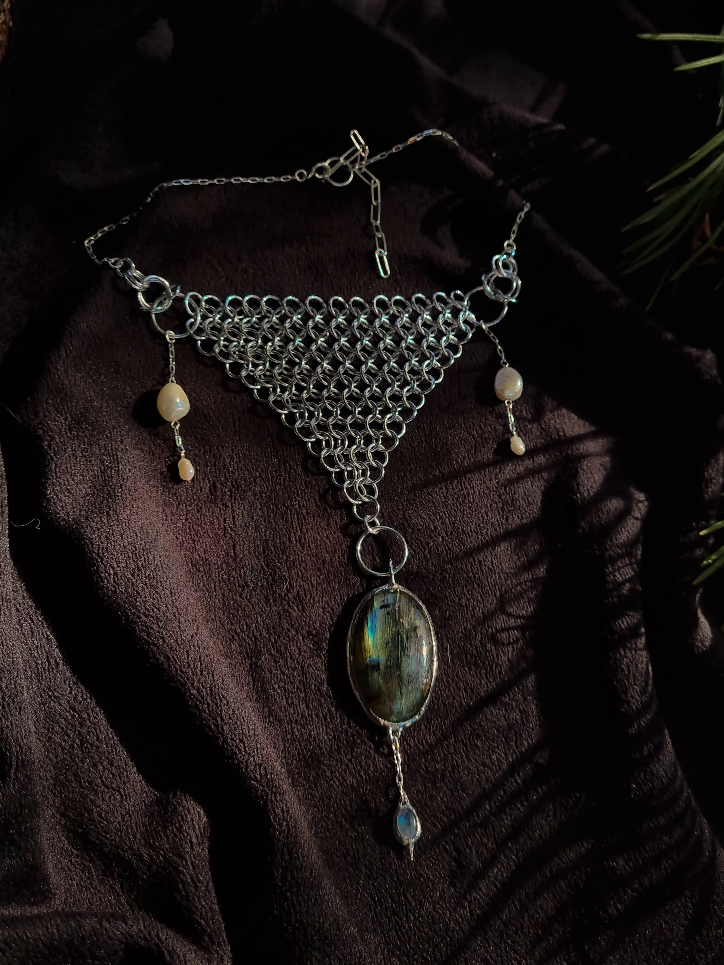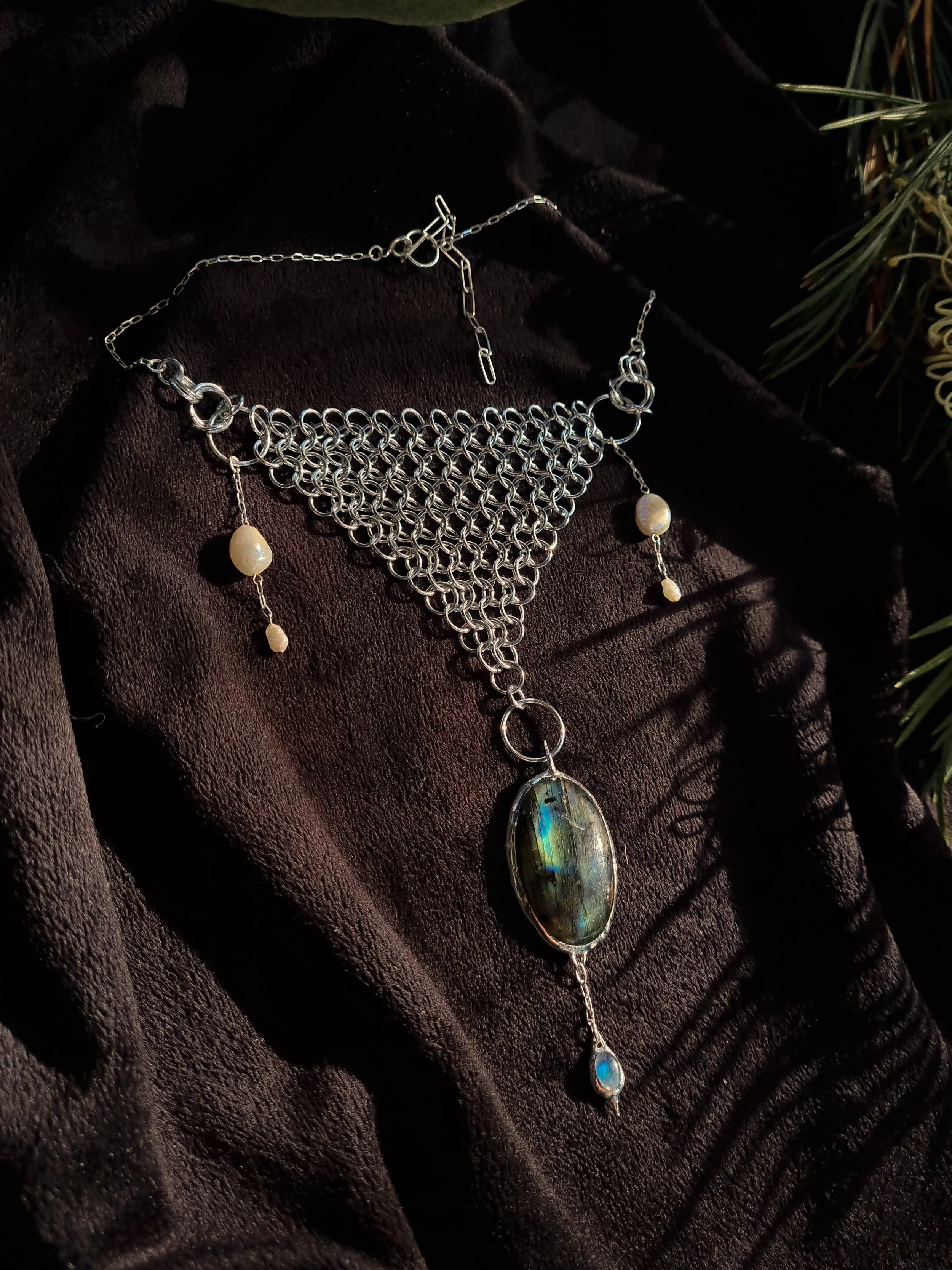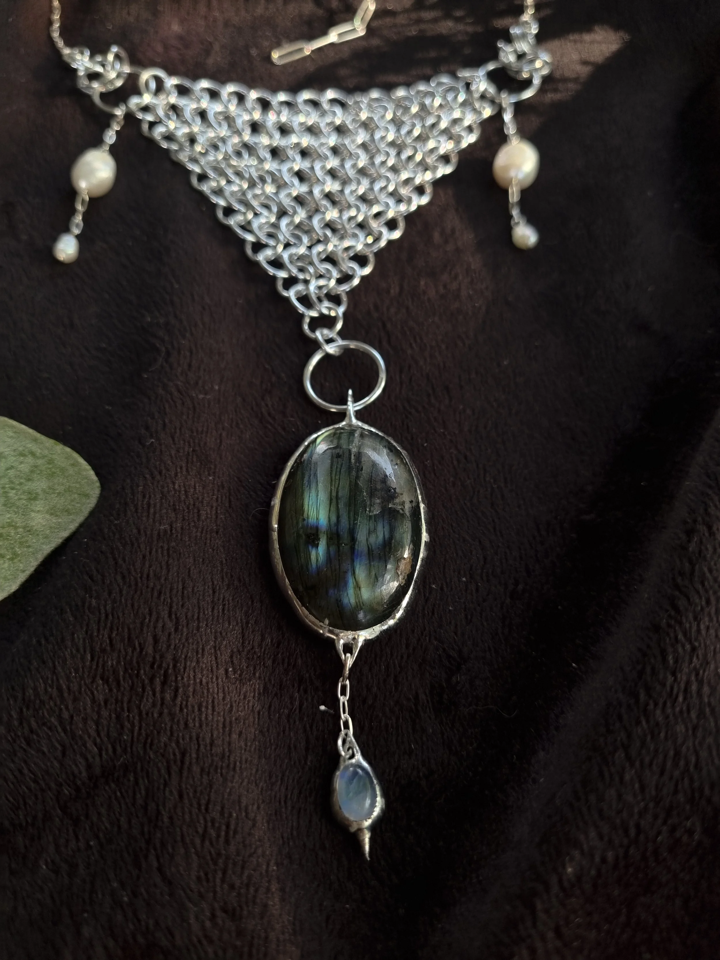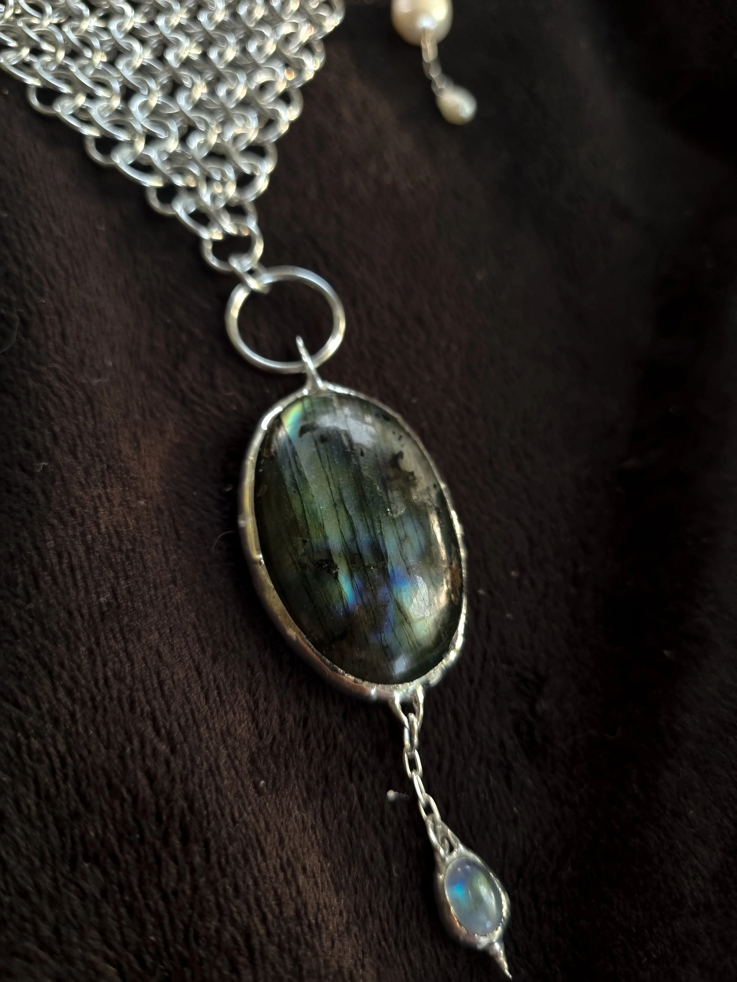 A brilliant moonstone with a soft blue flash melting into green and yellow around the edges, suspending two freshwater pearls, hung from a sterling silver chainmaille unit on a 45cm sterling silver chain